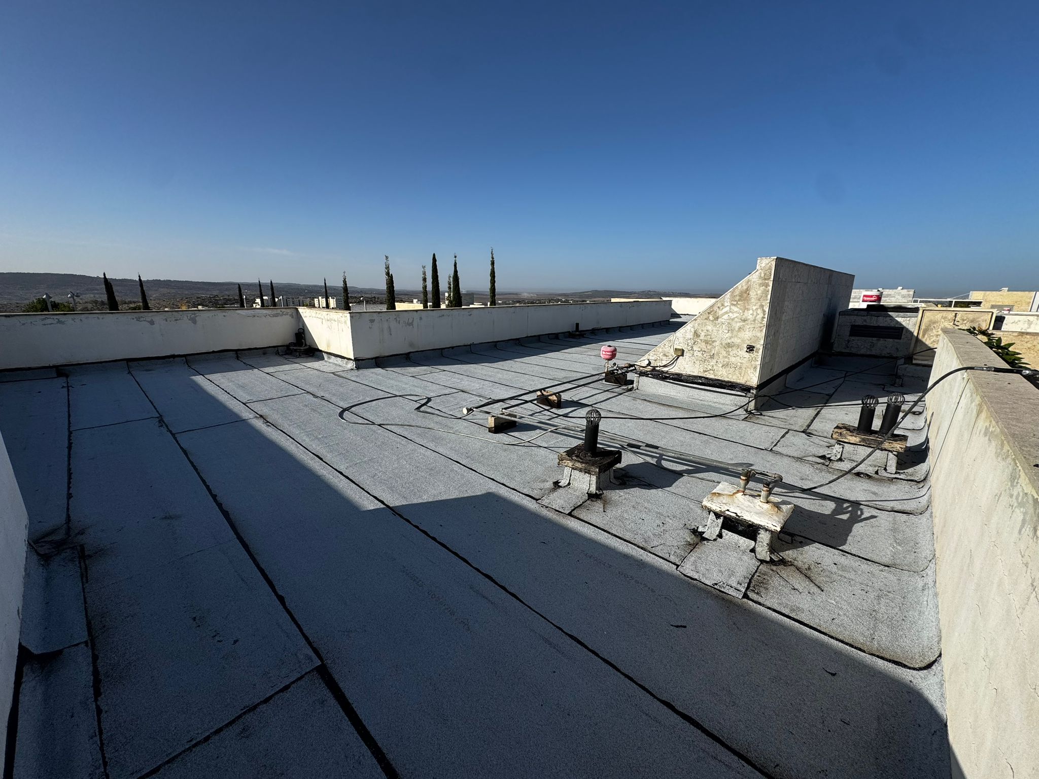 בשלב הבא הונחו יריעות חתוכות בהתאמה אישית סביב המרזבים, דודי השמש והצנרות. אזורים אלה זוכים תמיד לטיפול מיוחד – גם מבחינת החומר וגם מבחינת ההלחמה – כדי למנוע נזילות עתידיות.