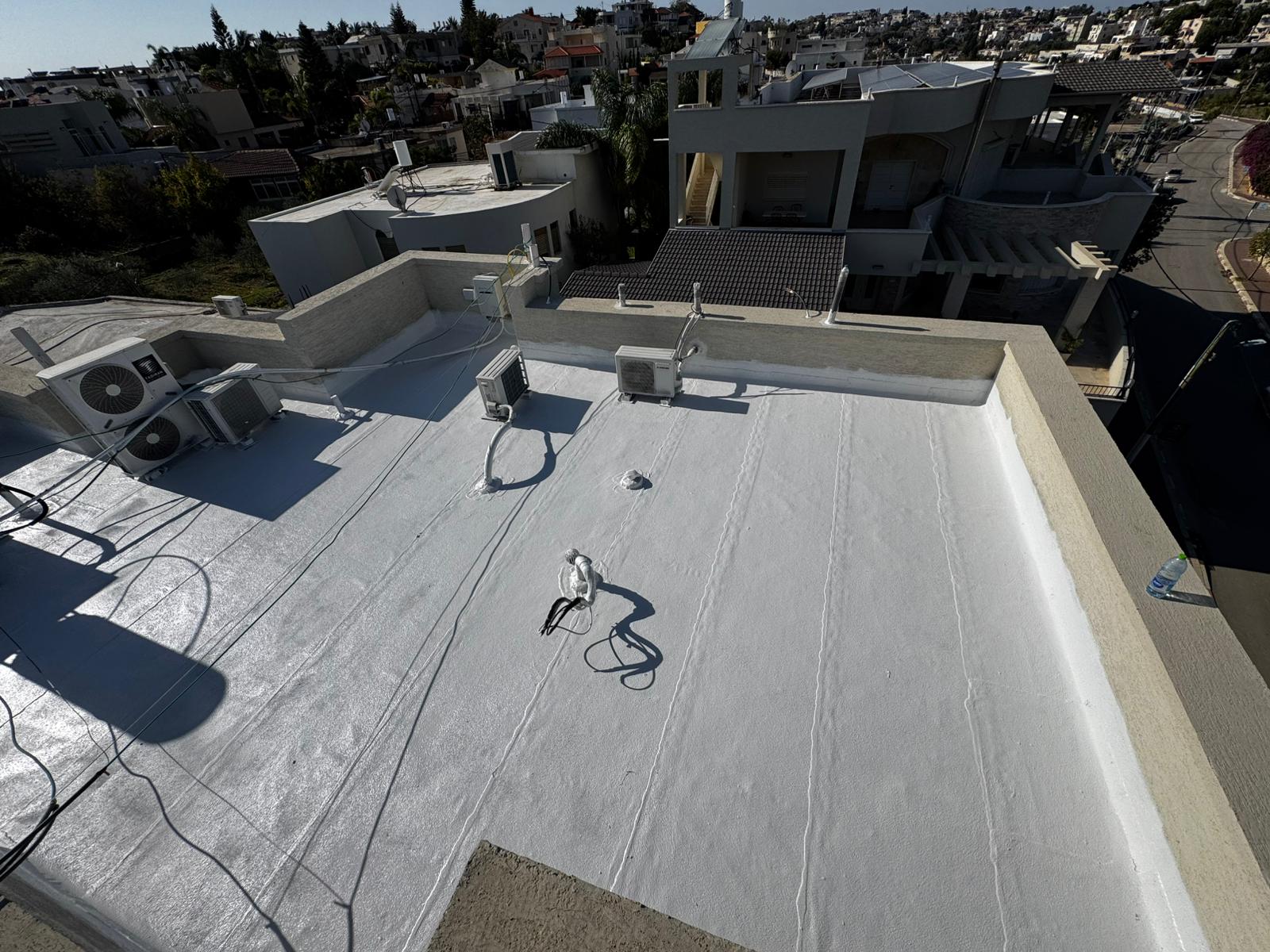 לאחר הנחת היריעות והריתוך המדויק, יישמנו שתי שכבות של אקריל־פז משוריין ליצירת כיסוי אחיד, לבן ועמיד.